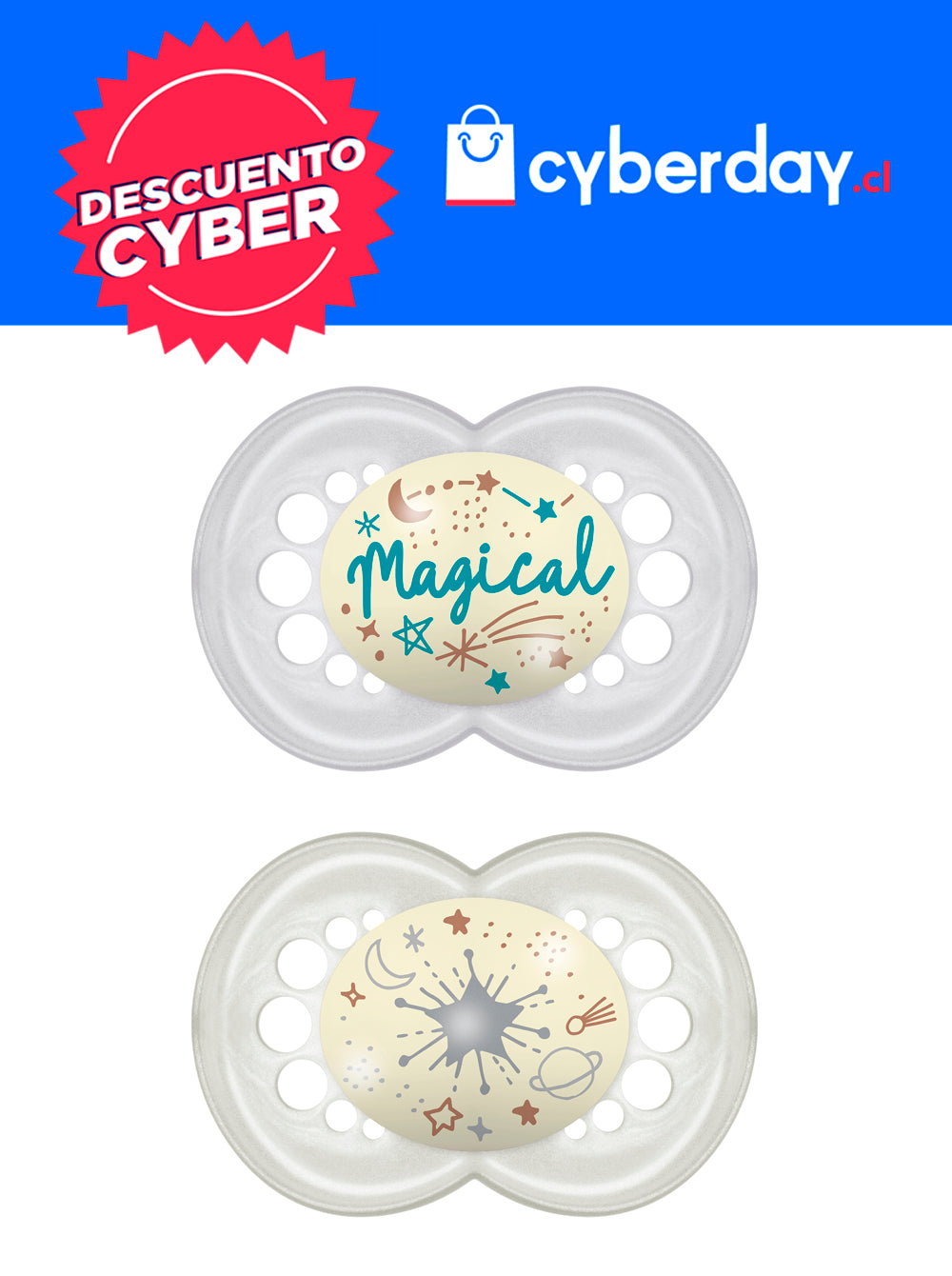 - Chupete que brilla en la oscuridad: el botón luminoso facilita encontrar el chupete durante la noche sin molestar al bebé ni encender luces.